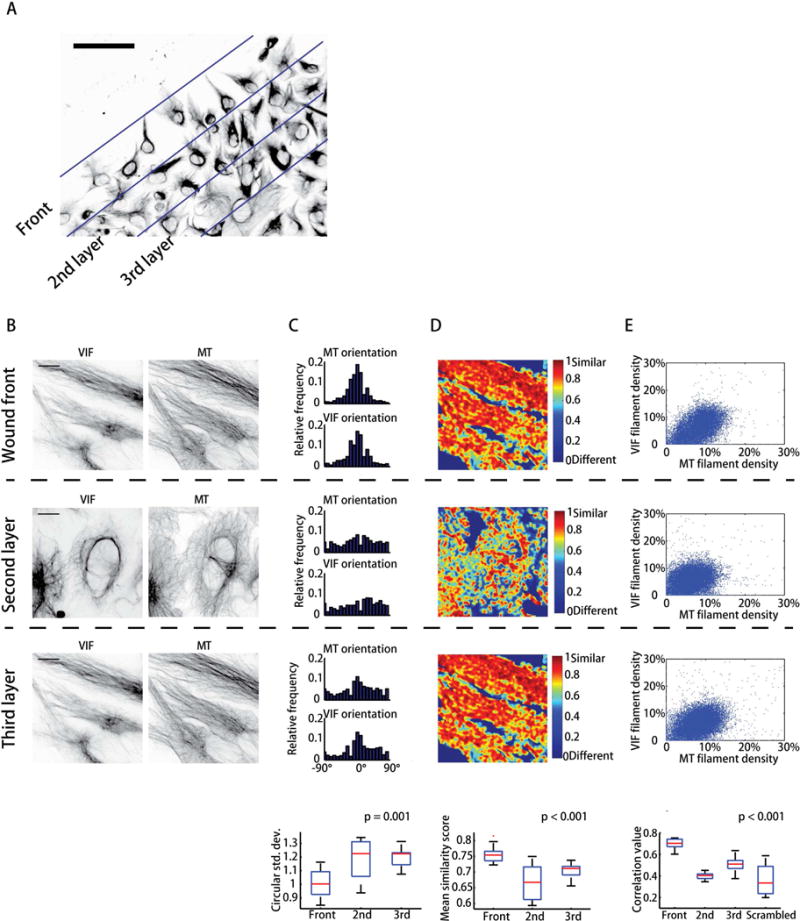 VIF and MT networks are co-aligned in cells at the wound edge. (A) Definition of bands in wounded1 cell monolayer with increasing distances from the wound edge. (B) VIF and MT raw images in different layers. (C) Distributions of local orientation in three bands. Bottom of column: ANOVA of circular standard deviation of orientation distribution (n = 30 cells). (D) Score map of VIF/microtubule network similarity. Bottom of column: ANOVA of mean of network similarity score (n = 30 cells). (E) Scatter plot of VIF vs. MT filament densities. Bottom of column: ANOVA for filament density correlation values (n = 30 cells).