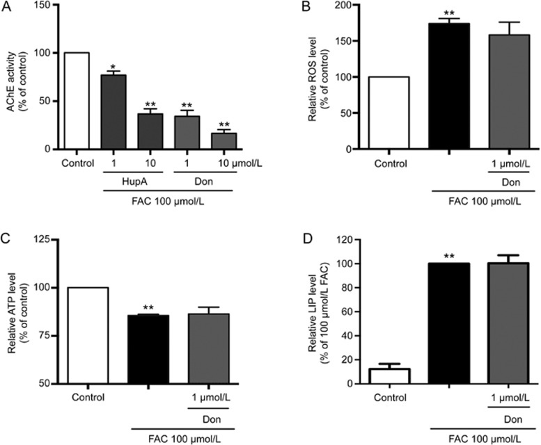 Effects of Don on the level of ROS, ATP and LIP in FAC-exposed rat cortical neurons. (A) HupA (1 and 10 μmol/L) and Don (1 and 10 μmol/L) significantly reduced the AChE activity in concentration-dependent manner. n=3. (B) Don had no influence on the level of ROS in FAC-exposed neurons. n=3. (C) Don had no influence on the level of ATP production in FAC-exposed neurons. n=4. (D) Don had no effects on the level of LIP in FAC-exposed neurons. n=3. Data were shown as mean±SEM. *P<0.05, **P<0.01 vs control group.