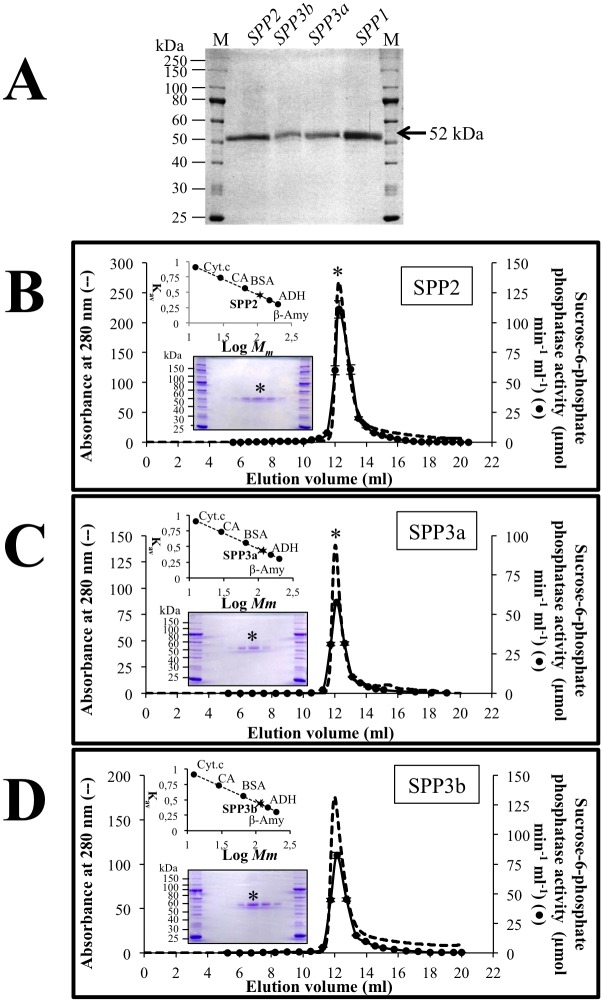 (A) SDS-PAGE analysis of purified SPP fractions after gel filtration (Superose 12 10/300 GL). In each case 4 μg of protein were loaded per lane. Purification folds were 306, 109 and 226 for SSP2, SPP3a and SPP3b, respectively. This parameter could not be estimated for SPP1 due to its lack of activity. Proteins were visualized by staining with Coomassie Blue R-250. Lane M, Molecular mass (kDa) markers. Elution profiles of recombinant Nt-Histag-SPP isoform SPP2 (B), SPP3a (C) and SPP3b (D), applied to a Superose 12 10/300 GL column. A calibration curve is displayed on the upper insert. Molecular mass standards: β-Amy, β-Amylase (200 kDa); ADH, alcohol dehydrogenase (150 kDa); BSA, bovine serum albumin (66 kDa); CA, carbonic anhydrase (29 kDa); and Cyt.c, cytochrome c (12.4 kDa). SDS-PAGE analysis of the fractions around the activity peaks (highest activity fraction marked with an asterisk) is displayed in the lower insert. As observed, both peaks, corresponding to absorbance at 280 nm (broken line) and sucrose-phosphate phosphatase activity (solid line), co-eluted.