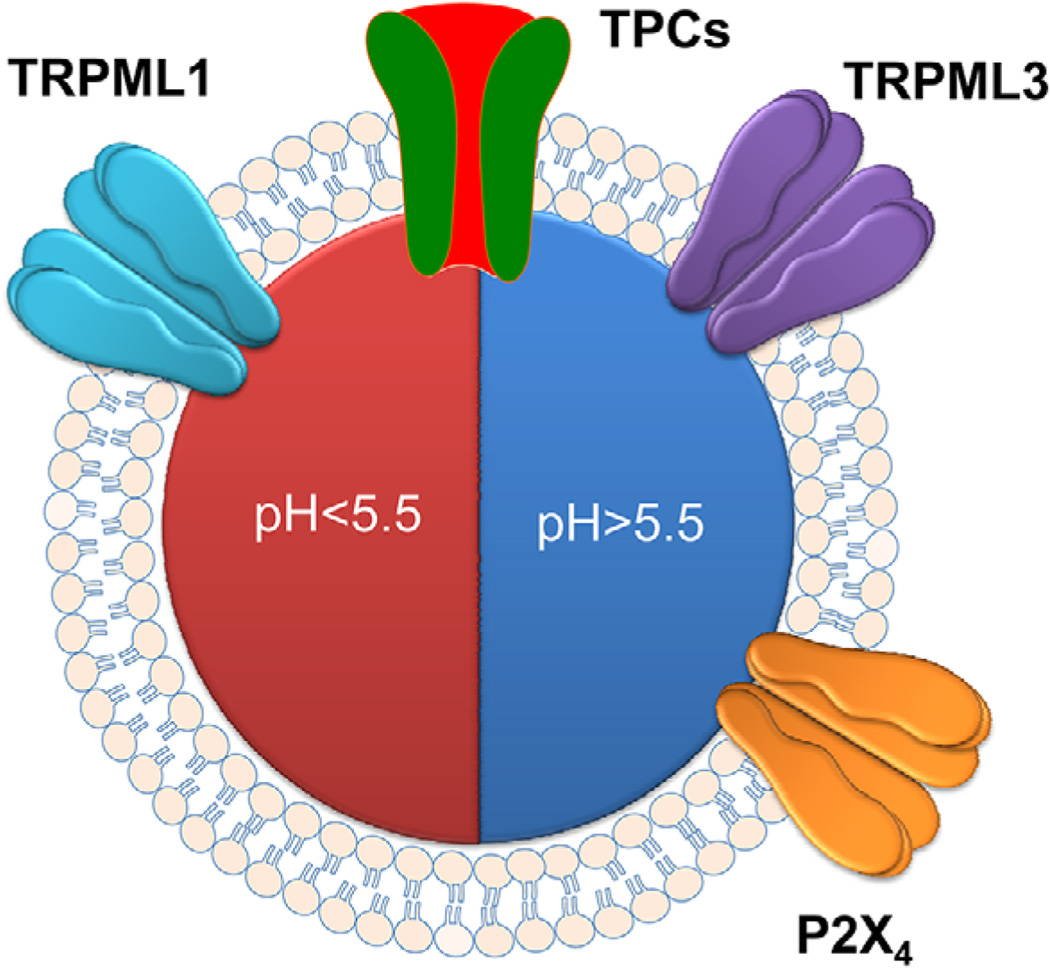 Different pH optima of lysosomal Ca2+-permeable channels. For channels that mediate Ca2+ release from the lysosomes, TRPML1 works optimally in acidic pH, TRPML3 and P2X4 works best at neutral pH, TPCs can work in a broad pH range.
