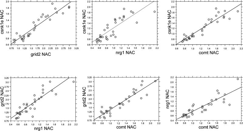 Simple regression plots for correlations among expression levels of csnk1e, grid2, nrg1, and comt in the NAC. These correlations typify the pattern also detected in the VH and mPFC, as described in the text, of highly correlated expression levels of the four genes within any given brain region