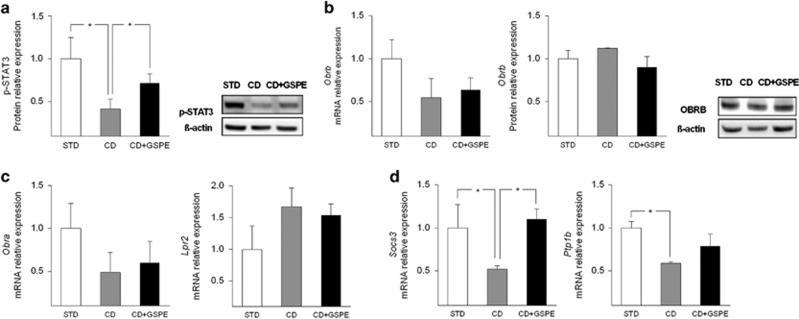 In the mWAT (Figure 4b), the CD-fed rats showed a significant increase in p-STAT3 compared with the STD-fed rats, whereas the GSPE treatment significantly restored the p-STAT3 values to those of the STD-fed rats. Furthermore, the mRNA levels of Obrb, Socs3 and Ptp1b in mWAT were also similar in all three groups of animals.