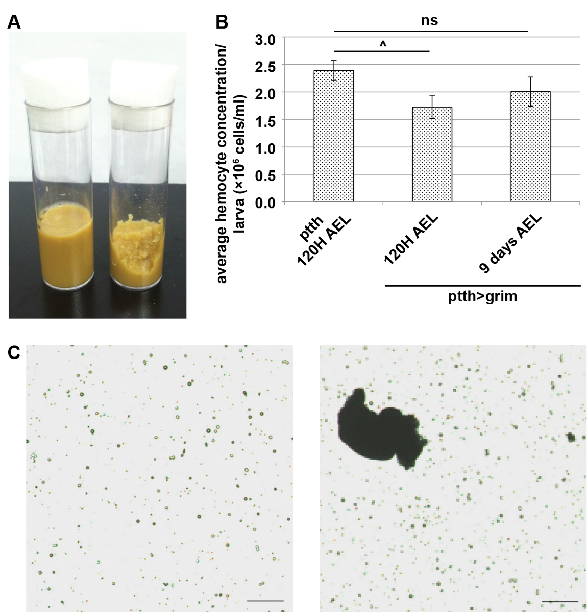 Figure 1. Circulating Hemocyte Concentration.A) A portion of standard Drosophila medium was removed (right) to promote egg laying during a 2 hr egg collection period. B) The average hemocyte concentration per developmentally delayed larva (ptth>grim) was lower than the average hemocyte concentration per control larvae (ptth) 120 hr after egg laying (AEL). The average hemocyte concentration per delayed larva approached control level 9 days AEL. Error bars represent ± s.e.m. C) Hemolymph samples without (left) and with (right) debris. Scale bars represent 0.1 mm. Please click here to view a larger version of this figure.