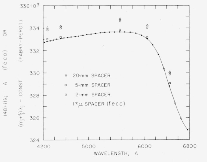 From the photograph of the interference pattern. the ring diameters were measured for several wavelengths. For the 2-mm spacer, two rings were measured at each wavelength; for the others, four rings were measured. The fractional orders, f, of interference at the center of the patterns were calculated with a least squares procedure described by Meissner [6].
