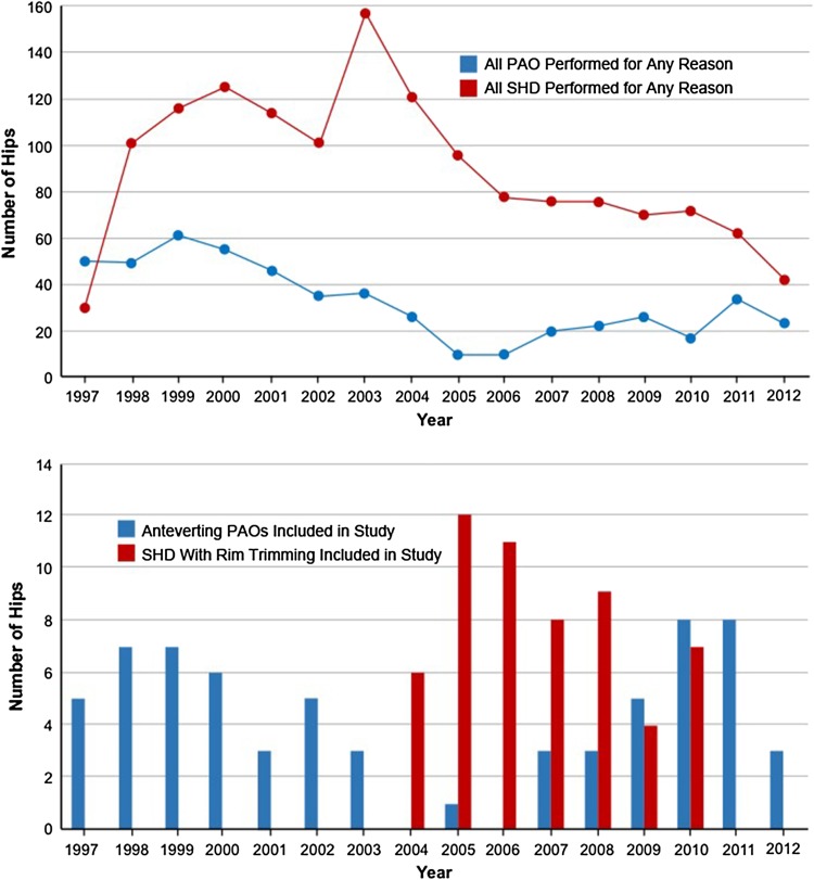 The total number of patients undergoing PAO and surgical hip dislocation (SHD) and the number of patients included in this study between 1997 and 2012 are shown.