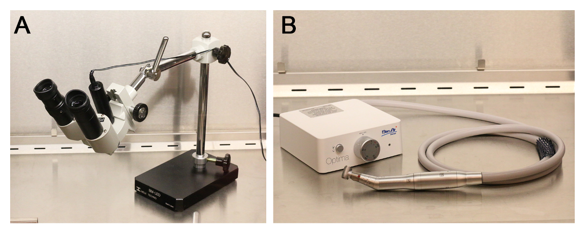 Figure 1: The Equipment Setup for the Pulp-capping Procedure. (A) A microscope (10X) for visualizing the mouse tooth. (B) The high-speed handpiece and the electric motor engine for preparing a Class I preparation to expose the pulp. Please click here to view a larger version of this figure.