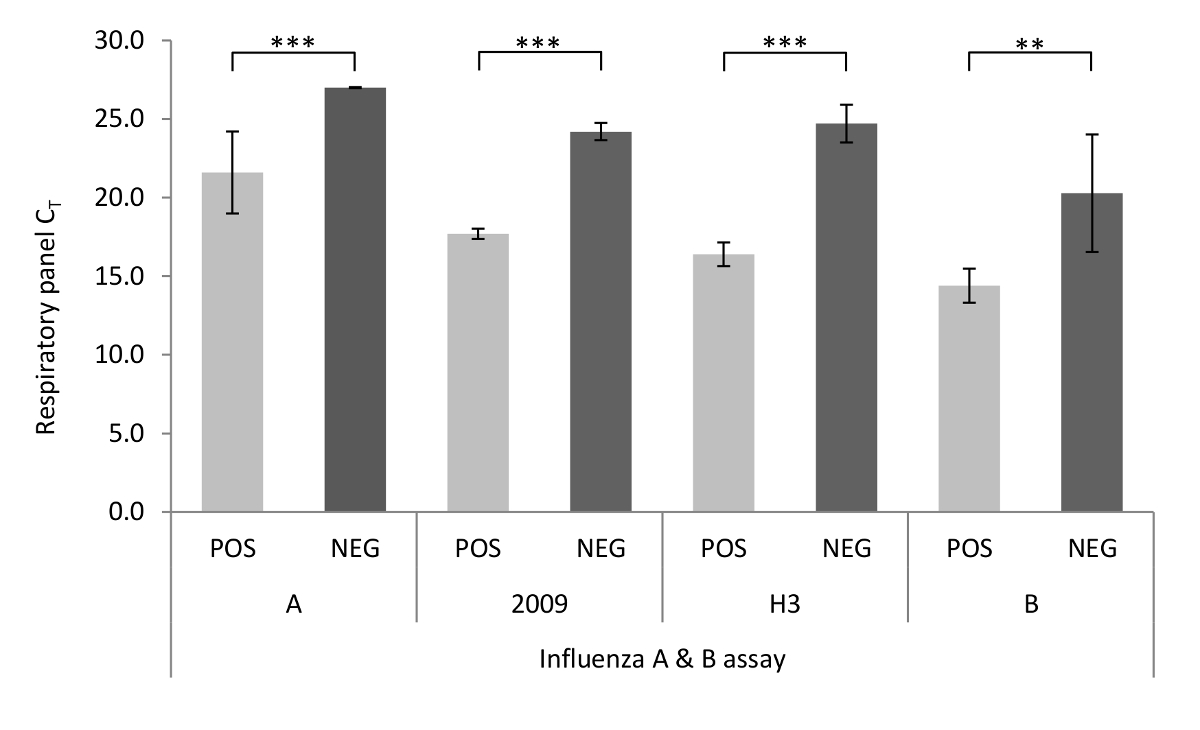Figure 1:Average CT values determined by RP assay for samples that were positive and negative, respectively by the assay for each influenza subtype. Error bars represent standard deviation. **, p <0.01; ***, p <0.001. Please click here to view a larger version of this figure.