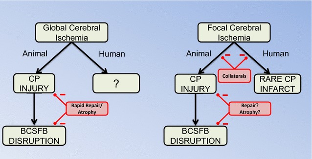 In animal studies, there is evidence that both transient global cerebral ischemia and focal cerebral ischemia cause choroid plexus (CP) injury and blood-CSF barrier (BSCFB) disruption. There is evidence that the damage after global ischemia is quickly repaired and this probably involves shedding of damaged cells resulting in CP atrophy. This has not been examined in focal cerebral ischemia. In humans, the effects of transient global cerebral ischemia (e.g. cardiac arrest) on the CP have not been examined. There are very rare reports of CP infarcts after focal cerebral ischemia in patients, but the occurrence of CP damage after focal cerebral ischemia is almost certainly limited by the rich collateral circulation to the CP