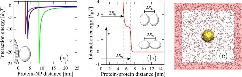 In our CG approach, we introduce effective potentials for protein–NP and protein–protein (two-body and three-body interactions) with implicit solvent. For the protein–NP effective interaction, we adopt a description within the framework of the well-established DLVO theory for colloidal dispersions (Figure 2a and eq S8 in SI).18,19