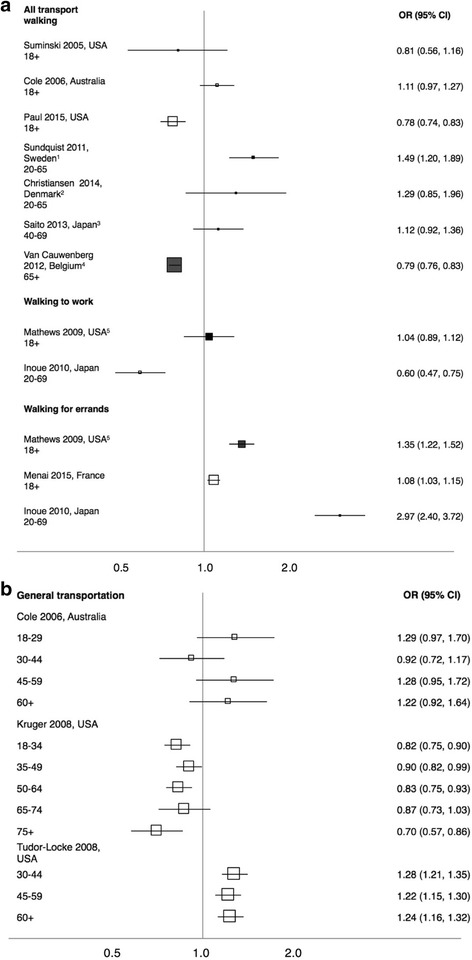 Forest plot showing odds ratios for the prevalence of walking for transport amongst women in comparison to men among (a) all participants and (b) by age group. Clear markers indicate bivariate analysis; filled markers indicate multivariate analysis, and footnotes detail control variables included in each model. Marker size is proportional to the sample size of the study. 1 Age, family income, marital status, neighbourhood socioeconomic status, neighbourhood walkability. 2 Education, income, neighbourhood walkability, life stage, distance to work or education, nativity, destination accessibility. 3 Age, education, employment, household economic status, presence of children in household, health, car ownership, access to shops, presence of sidewalks. 4 Age, education, functional limitations, area of residence. 5 Education and employment