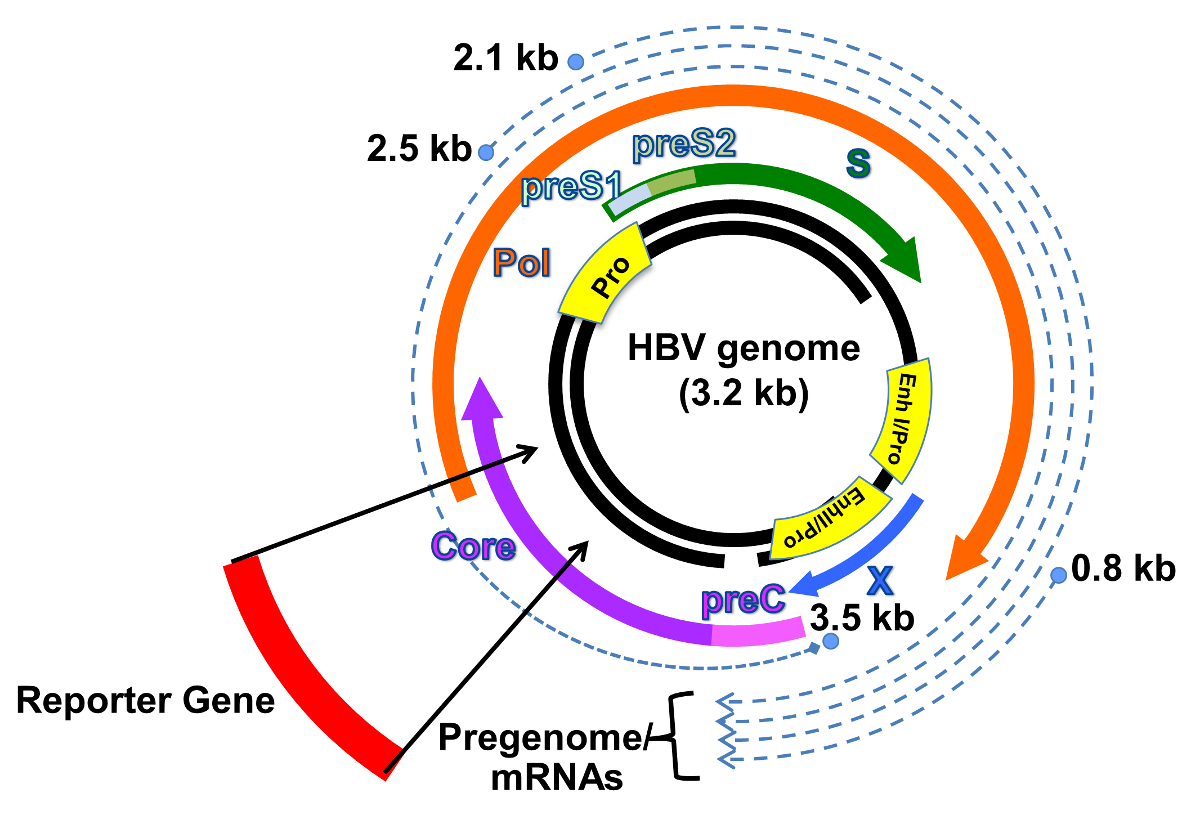 In summary, this system can be used to evaluate HBV infection by measuring reporter activity. Therefore, there is no need to conduct complicated assay techniques such as PCR, RT-PCR, HBV Core or S antigen ELISA to evaluate HBV infection/replication. Finally, because this reporter HBV is replication incompetent, there is no risk of infection.