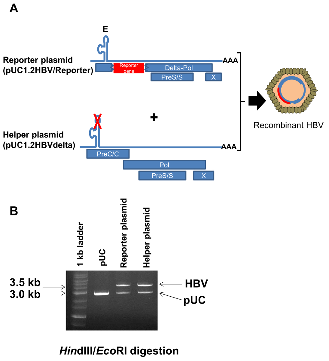Figure 2: Schematic for the generation of recombinant HBV. (A) Blue lines indicate the pregenome RNA. The "A" stretch represents poly A at the 3ʹ terminus. Blue boxes indicate the coding region for each virus protein. The red box indicates a reporter gene translated from its own initiation codon. The reporter plasmid cannot produce PreCore and Pol, and the helper plasmid containing 2 mutations in the encapsidation signal (CTGTGCC to CTATGTC) expresses all HBV proteins. E: Encapsidation signal. (B) The reporter plasmid, helper plasmid and pUC plasmid were digested with EcoRI and HindIII. These digested plasmids were subjected to gel electrophoresis. Please click here to view a larger version of this figure.