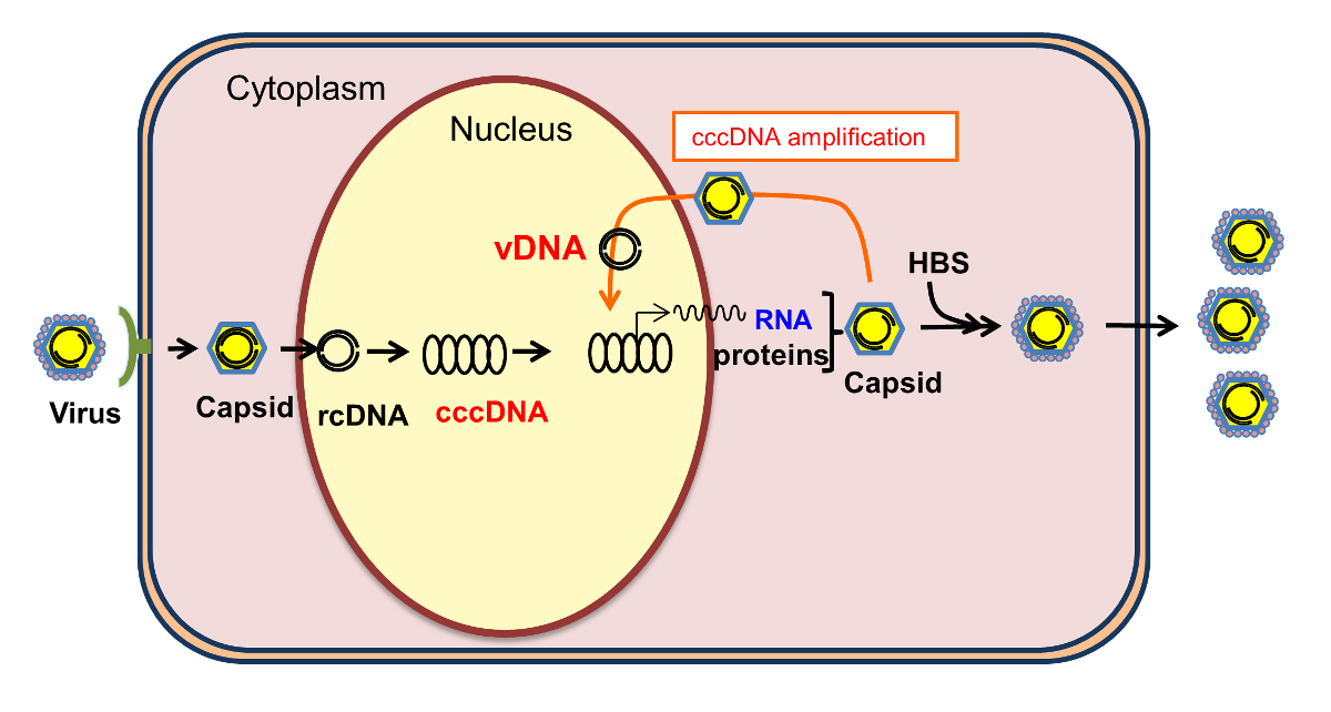 Figure 6: Schematic of the HBV life cycle. HBV enters into cells through virus receptors including NTCP. Capsid-associated relaxed circular DNA (rcDNA) is uncoated and converted to covalently closed circular DNA (cccDNA) in the nucleus. cccDNA functions as a template for mRNA transcription. The genomic RNA is encapsidated to the virus capsid by assembling with proteins for core and pol. Before further assembling with HBS proteins, the capsid is involved in amplifying HBV DNA by a process called the cccDNA replication process. Virus particles assembled with HBS proteins eventually are released outside the cell. Please click here to view a larger version of this figure.