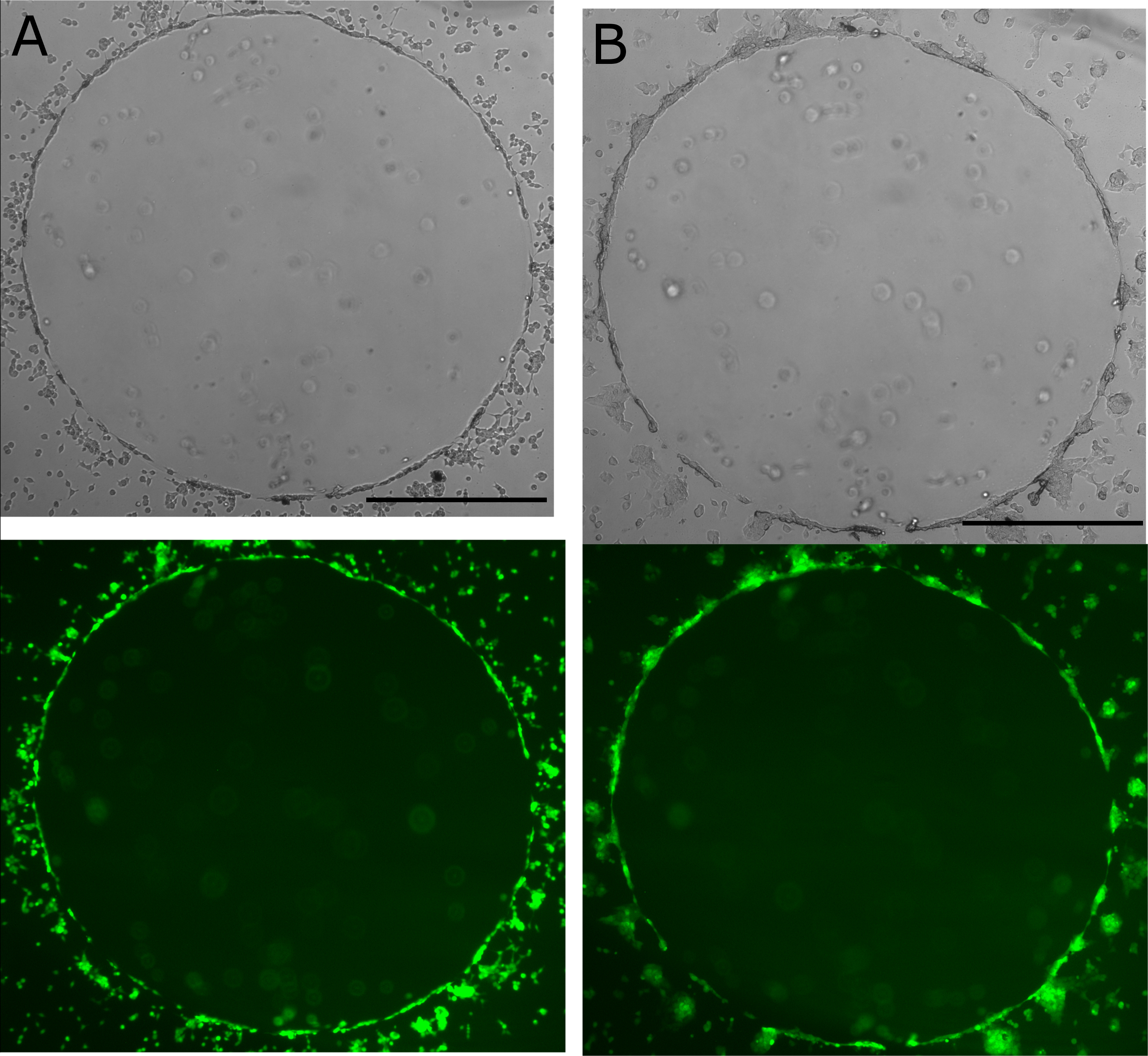 Figure 5. Matrix Assay with FaDu. Head and neck squamous cell carcinoma cell line FaDu added around a matrix droplet without a DRG on day 3. brightfield and green fluorescent microscopy (4X) shown on day 4 (A). Note that the tumor cells do not enter the matrix or grow over the top of it, even by day 5 (B). Scale bar represents 1 mm. Please click here to view a larger version of this figure.