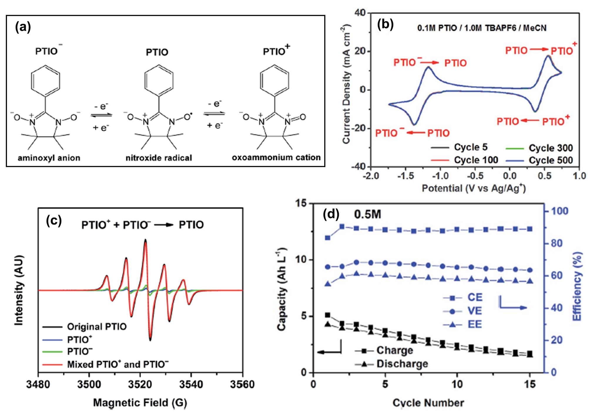 The unique advantages of the symmetric PTIO flow battery system are highly ascribed to the electrochemical properties of PTIO, an organic nitroxide radical compound. PTIO can undergo electrochemical disproportionation reactions to form PTIO+ and PTIO− (Figure 2a). These two redox pairs are moderately separated by a voltage gap of ~1.7 V (Figure 2b) and can be used as both anolyte and catholyte redox materials in a symmetric battery chemistry. Using PTIO as a redox material can eliminate the need for mix-reactant electrolytes and enable high effective redox concentrations.