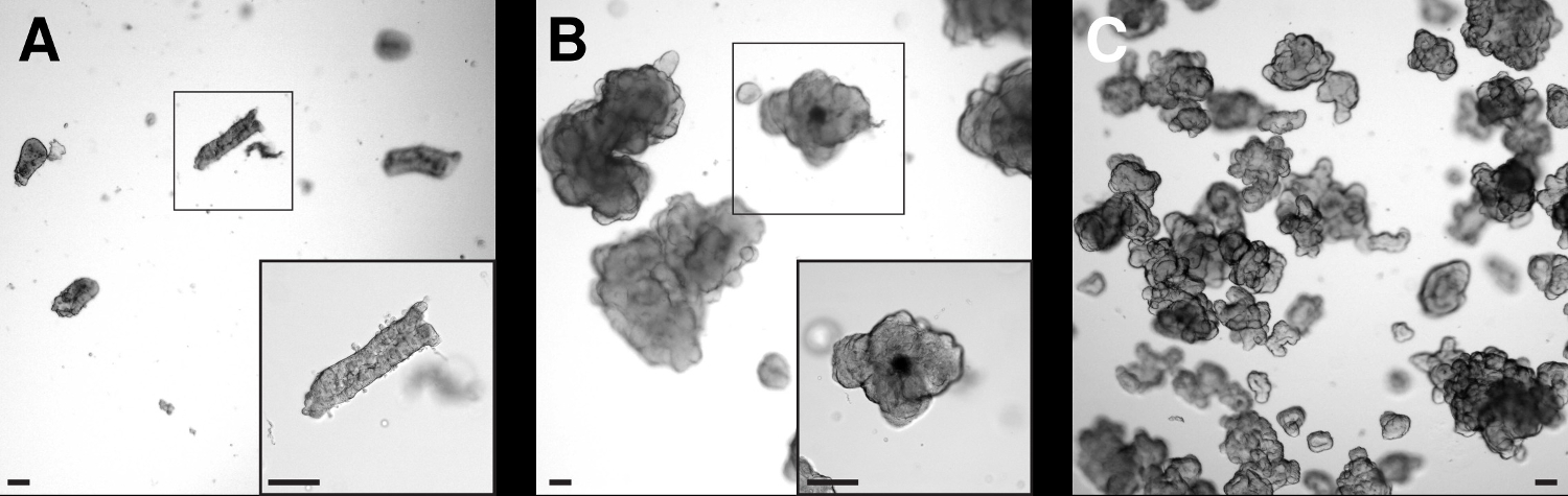 When the organoids are thawed, it is important to have them in high density, so normally, they are thawed in a small volume (Figure4A). After one or two days in culture, and after observing that the organoids are increasing size (compare Figure 4A with Figure 4B-4C), the organoids are diluted in a ratio of 20-30 organoids per 10 µl of BMM, providing the right density to grow into a bigger size. If the organoids are too diluted, they can slow growth and can even differentiate and die. If the organoids are too crowded, the lack of space or the shortage of growth factors also slows the growth of the organoids and reduces the number of buddings.