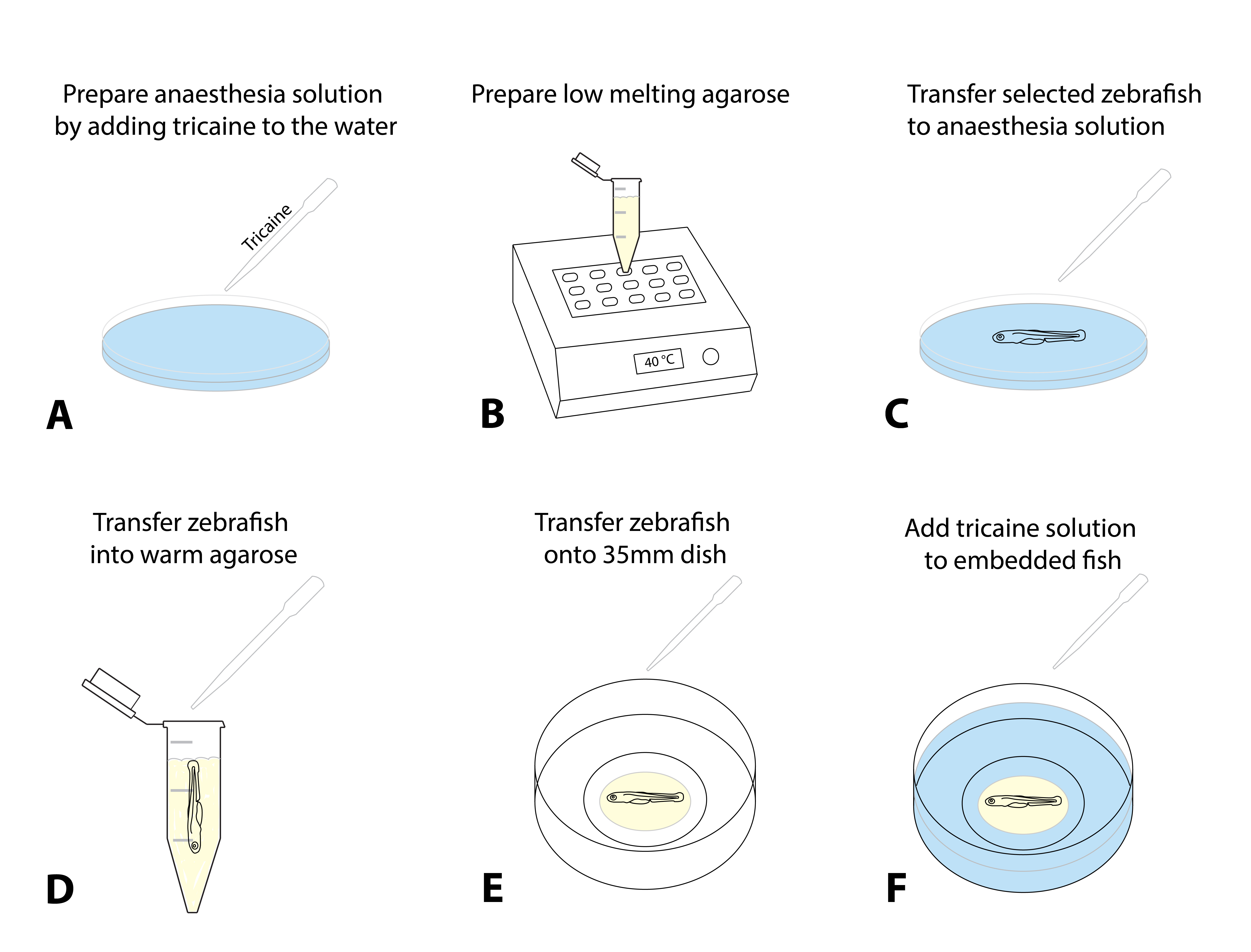 Figure 1: Embedding of zebrafish for live imaging. (A-F) Embedding procedure for live imaging: (A) Tricaine is added to egg water to anaesthetize the zebrafish at a starting dose rate of 50 mg/L. (B) Low-melting agarose (0.8 - 1.5%) is prepared and warmed up to 38 - 40 °C. (C) Using a transfer pipette, the screened and selected zebrafish are transferred into a dish with tricaine solution. After successful sedation (shallow opercular movement, decreased heart rate, lack of a touch-evoked response), a fish is transferred into the preheated agarose (D). Minimize the amount of egg water that is transferred into the agarose to prevent subsequent dilution. (E) Transfer a drop of agarose (~ 30 - 50 µL) containing the zebrafish onto a glass-bottom 35-mm dish. Perform this under a dissection microscope and use a brush to gently align the zebrafish to its preferred orientation. Wait 10 - 15 min, until the agarose is set, and add ~ 2 mL of tricaine solution to the dish (F). Please click here to view a larger version of this figure.