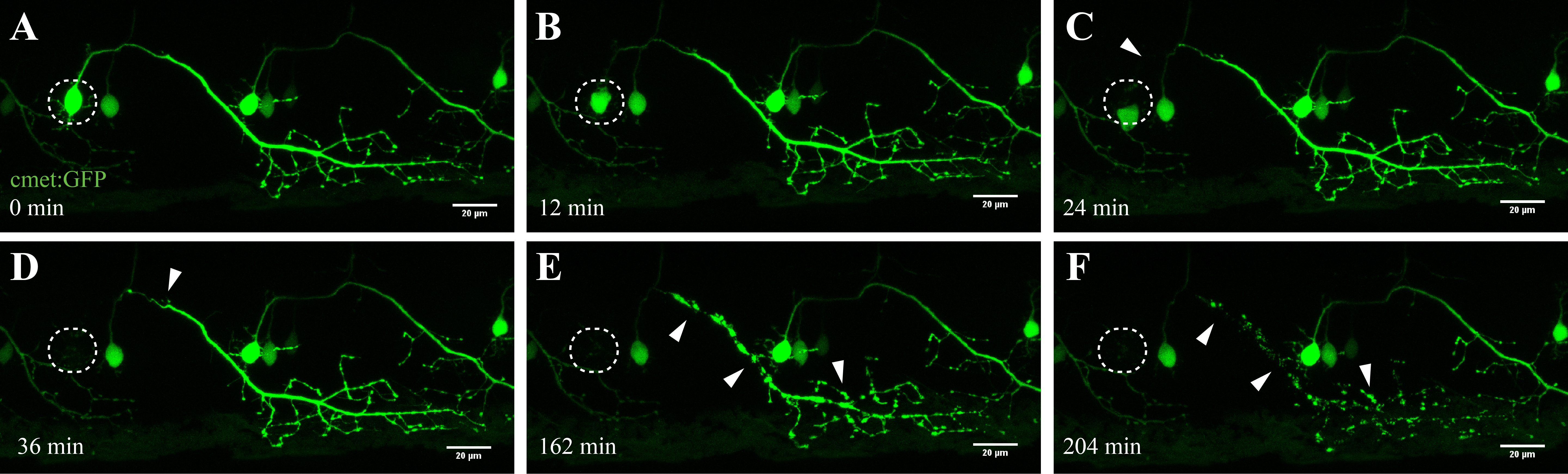 Figure 4: Anterograde degeneration of a UV-ablated neuron. Time-lapse imaging of the neurodegeneration of a UV-ablated spinal neuron. (A-F) UV-irradiation of a single spinal neuron (met:GAL4,UAS:EGFP; A; circle) resulted in the soma of the neuron shrinking and rounding up over time (A-C), followed by axonal fragmentation (C-F; arrowheads). The axonal degeneration started at the soma (site of ablation) and progressed anterograde toward the distal end of the axon until finally, the fluorescence in the soma disappeared and the entire axon showed "blebbing" (D-F). Scale bars = 20 µm. The 3D-rendered time-lapse movie of this ablation is shown in Video 1. Please click here to view a larger version of this figure.