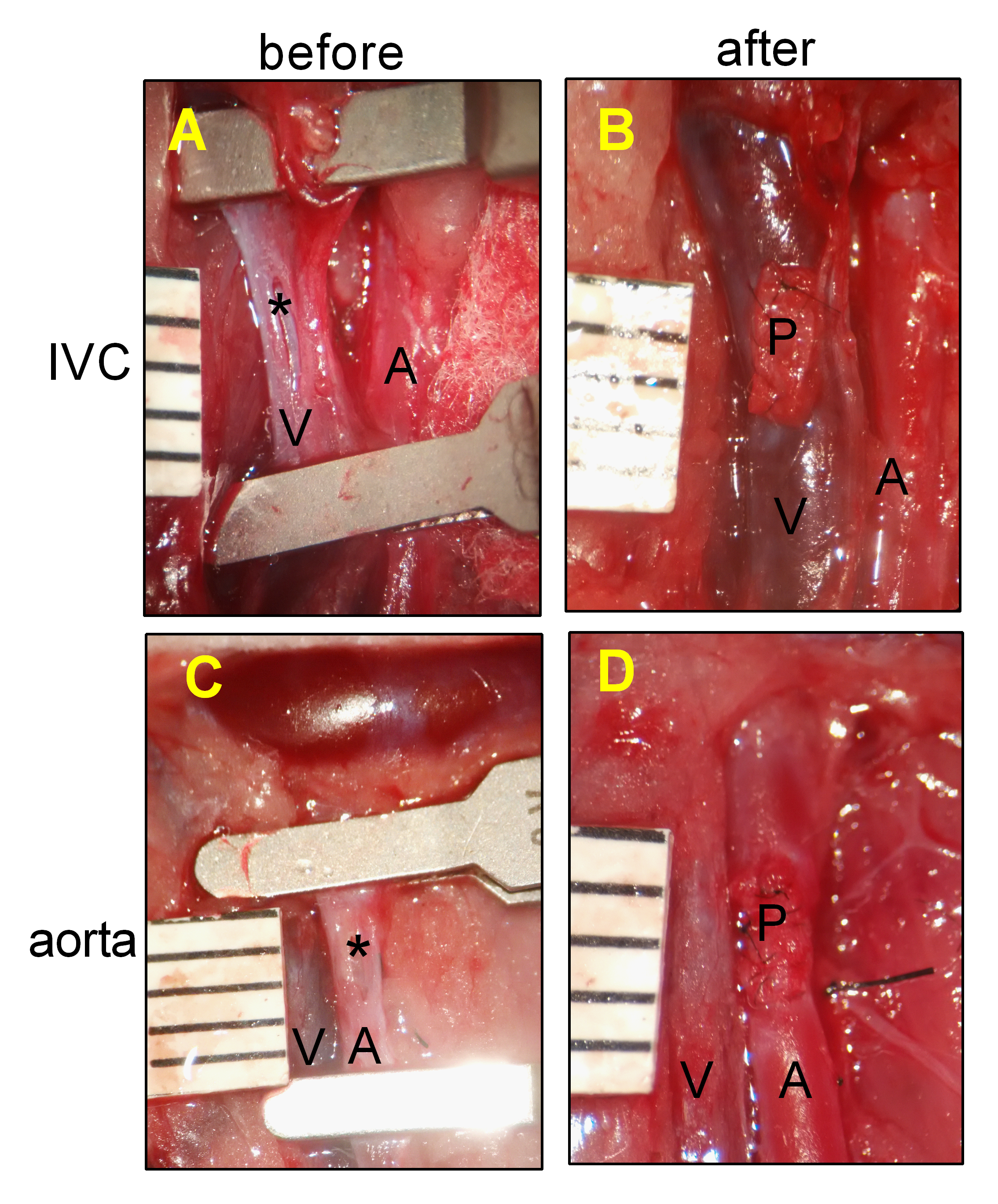 Figure 1: Rat Pericardial Patch Angioplasty. (A) Representative photograph showing the IVC venotomy. (B) Representative photograph showing the IVC after patch placement. (C) Representative photograph showing the aortic arteriotomy. (D) Representative photograph showing the aorta after patch placement. A, aorta; IVC, inferior vena cava; P, pericardial patch; *, posterior intima of IVC or aorta; ruler markings are 1 mm. Please click here to view a larger version of this figure.
