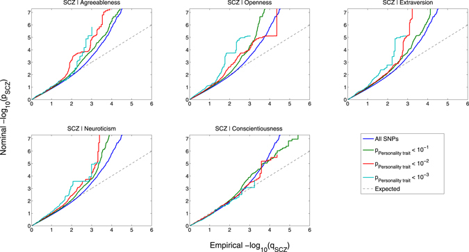 Conditional Q-Q plots of nominal versus empirical −log10 p-values (corrected for inflation) in schizophrenia (SCZ) below the standard GWAS threshold of p < 5 × 10−8 as a function of significance of association with agreeableness, openness, extraversion, neuroticism and conscientiousness at the level of −log10(p) ≥ 1, −log10(p) ≥ 2, −log10(p) ≥ 3 corresponding to p ≤ 0.1, p ≤ 0.01, p ≤ 0.001, respectively. Blue line indicates all SNPs. Dotted line indicates the null hypothesis.
