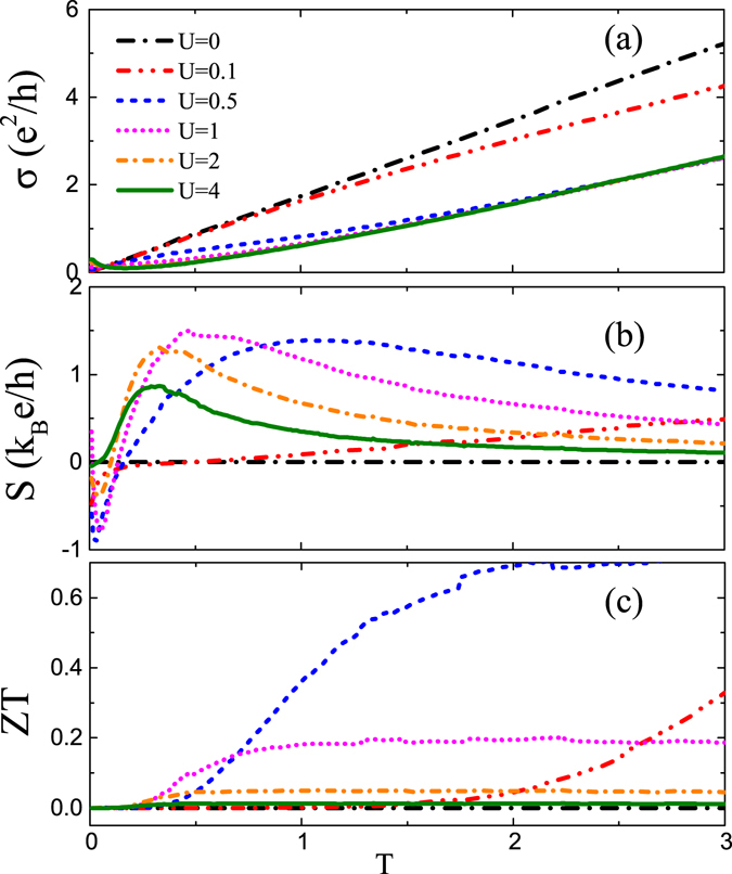 (a–c) The electric conductivity σ, the thermopower S, and the figure of merit ZT, respectively, at the Fermi level μ = 0 as a function of temperature T for various impurity potential U as indicated. The other parameters are the same as in Fig. 1.