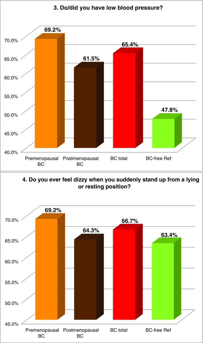 Figure 2 summarises the prevalence of individual “Flammer Syndrome” symptoms (1–15) in two main groups of comparison—“BC total” patients versus the reference group of “BC-free” individuals as well as in individual subgroups of BC patients subdivided according to their menopausal status. Higher prevalence in “BC total” (marked in red) has been demonstrated for all 15 symptoms investigated in this study. Statistical significance has been recorded for symptoms 1 (cold extremities), 2 (feeling cold), 5 (prolonged sleep onset), 7 (headache), 8 (accompanying symptoms), 9 (drug sensitivity) and 11 (smell perception); corresponding p values are provided in Table 3. Although being statistically non-significant (p = 0.103), a substantially greater prevalence has been demonstrated for symptom 6: “no feeling of thirst and drinking too little” the BC patients, in general, have demonstrated two times more frequently compared to the disease-free reference group; for the postmenopausal BC, this difference was even more pronounced. Also, the appearance of tinnitus (symptom 14), although being statistically non-significant (p = 0.095), was evidently more frequent in BC, particularly in the premenopausal subgroup demonstrating about two times higher prevalence compared to the disease-free reference group. Symptom 3 (low blood pressure) was more specific for the premenopausal BC demonstrating 22% higher prevalence against the disease-free reference group. In contrast, symptom 12 (low body weight in early adulthood) was more specific for postmenopausal BC. A slightly higher prevalence was demonstrated for symptom 4 (dizziness) in BC. Strong plurality has been demonstrated amongst the BC subgroups for the following three symptoms: 10 (pain, more specific for the postmenopausal BC), 13 (perfectionism, more specific for the postmenopausal BC) and 15 (skin blotches in stress, more specific for the premenopausal BC) as summarised in Table 3.