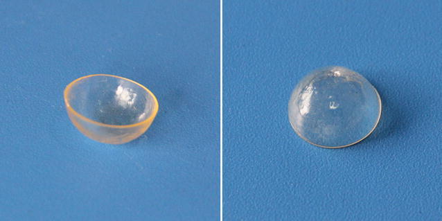 In the preparation course of a BRI/PHEMA contact lens, the monomer HEMA and the PEG-DMA were co-polymerized by initiating with a UV light free radical initiator D2959. Using this initiator system, a PHEMA film can be obtained at room temperature. The BRI/PHEMA film prepared using UV-light copolymerization was visually transparent, indicating brimonidine tartrate was well dispersed in the composite film. The resultant PHEMA and BRI/PHEMA films could be tailored into hard contact lenses which are shown in Fig. 2. The hard contact lens could further form soft-hydrogel contact lens after swelled in water.