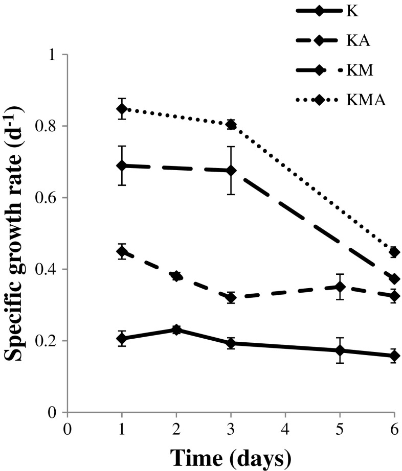 The growth parameters differed significantly depending on the conditions used for the cultivation (Table 1). The maximum specific growth rate (μ = 0.80 day−1) was obtained under the mixotrophic growth (KMA), and the minimum specific growth rate (μ = 0.19 day−1) was achieved under the control conditions (K). In addition, the biomass doubling time was shortened from 86 h in the control conditions to 21 h under the mixotrophic culture conditions.