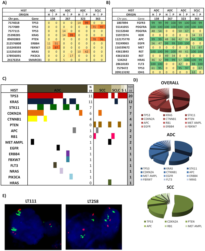 Pathology examination and molecular analyses of the established PDX models and their parental tumours were carried out to confirm the accuracy of these in vivo models. Immunohistochemistry analysis of 27 PDXs confirmed the parental tumour diagnosis corresponding to 20 ADC, 4 SCLC and 3 SCC. Interestingly, the same profile was maintained for more than ten passages in mice (Fig. 1A, Table 3). In the 20 ADC, comparative analysis of histologic patterns, stroma, necrosis percentage and immunohistochemistry markers (TTF-1, p40, vimentin, Ki-67 antigen and synaptophysin) showed a general maintenance of the relevant profiles over several passages in mice. In particular, heterogeneity of histologic patterns in parental tumour was maintained in the corresponding LcPDXs, although there was in late passages (P > 10) a slight tendency for solid pattern to prevail and for acinar and cribriform patterns to be under-represented. Indeed, solid pattern was appreciable in 6 primary tumours, in 7 PDXs at P ≤ 10 and in 8 PDXs at P > 10; acinar pattern in 4, 3 and 2 and cribriform pattern in 6, 5 and 4, respectively (Table 3 and Supplementary Figure 3). Stromal component was generally lower in LcPDXs compared to parental tumours, but a higher level of stromal cells percentage was present in both early (P ≤ 10) and late stage (P > 10) PDXs than in cell line-derived XG (Fig. 1C, Table 3 and Supplementary Figure 3).