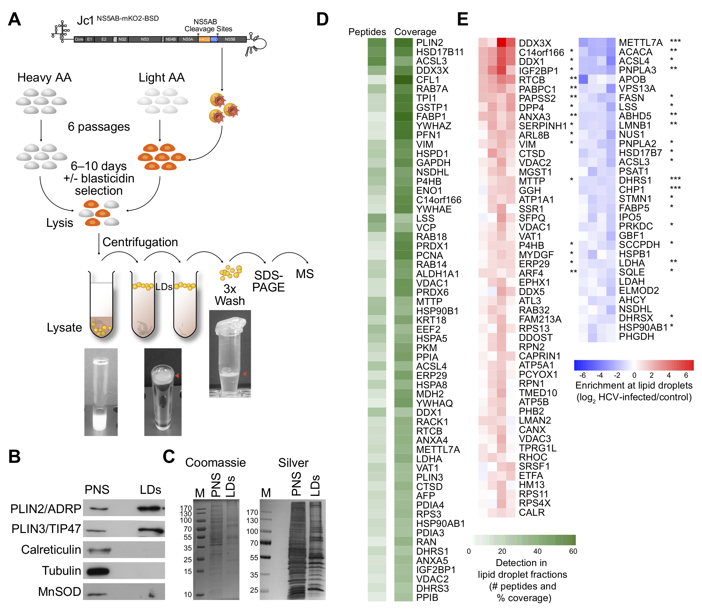 Figure 1:(A) Scheme of the Experiment. Naïve Huh7.5 cells were labeled with "heavy" amino acids or "light" amino acids. Cells carrying "light" amino acids were infected with an HCV reporter virus (Jc1NS5AB-mKO2-BSD). "Light" and "heavy" amino acid-labeled populations were mixed, and lipid droplets were isolated by two subsequent ultracentrifugation and three washing steps, separated by SDS-PAGE, and analyzed by LC-ESI-MS/MS. Note the floating white lipid droplet fraction (red arrow) after ultracentrifugation and washing in microfuge tubes. (B) Western blot analysis of post-nuclear and lipid droplet fractions shows an enrichment of lipid droplet marker proteins in lipid droplet fractions and a depletion of markers of other cellular compartments. (C) Coomassie blue and silver staining of post-nuclear supernatant (PNS) and lipid droplet fractions separated by SDS-PAGE. Silver staining is presented for visualization only. (D) Heatmap of the number of peptides and percentage of protein coverage of proteins identified in lipid droplet fractions of Huh7.5 cells (cutoff: ≥5 peptides and ≥20% coverage). (E) Heatmap depicting enriched or depleted lipid droplet-associated proteins after infection with HCV (normalized to the median, 1.5-fold cutoff, *p < 0.05, **p < 0.01, ***p < 0.001). Modified from 21. Please click here to view a larger version of this figure.