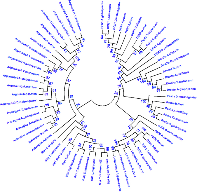 Phylogenetic tree of RNAi genes. The software MEGA 7.0 was used to construct the phylogenetic tree. Neighbor-joining method was performed and bootstrapping was used to estimate the reliability of phylogenetic reconstruction (5000 replicates).