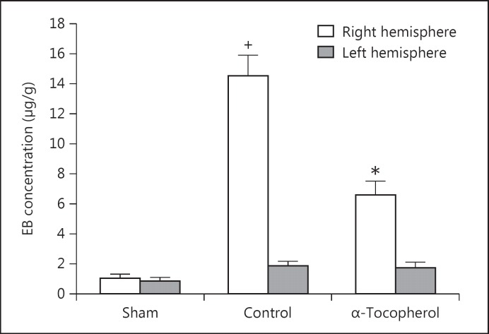 There was no statistically significant difference between the EB concentrations of the right side of brains between the groups (0.87 ± 0.22, 1.88 ± 0.29 and 1.74 ± 0.37 µg/g for the sham, control and α-tocopherol-treated groups, respectively). For the left side of the brain, the EB concentration of control ischemic rats was significantly more than that of sham-operated rats (p < 0.001, 14.58 ± 1.29 vs. 1.1±.22 µg/g, respectively). Postischemic treatment with α-tocopherol significantly lowered the EB concentration of the ischemic side of the brain (p < 0.001, 6.66 ± 0.87 µg/g; fig. 4, 5).