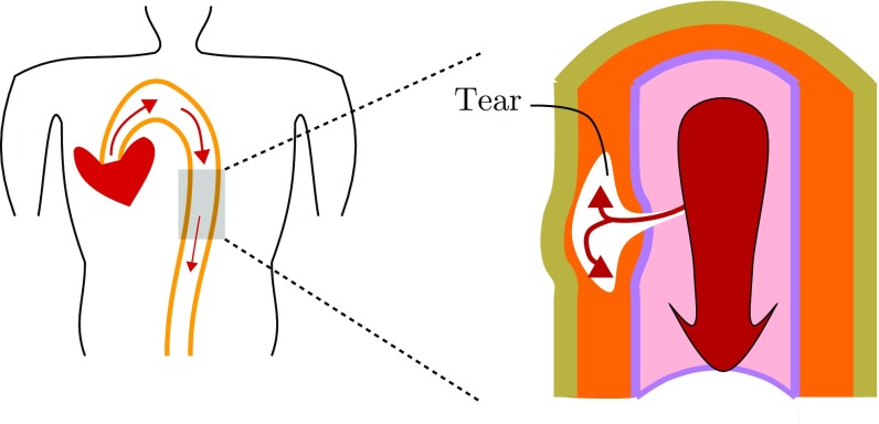 A cartoon of arterial dissection. A defect (a tear) that initially begins in the intimal layer of the artery extends into the media where it can grow to create a false lumen. Inflation of the false lumen by blood pressure can restrict the true lumen, restricting blood supply to major organs. In some cases, the tear can rupture the artery. The loading condition on the arterial wall, the geometry of the artery and of the tear, and the material properties of the arterial wall determine whether the tear propagates