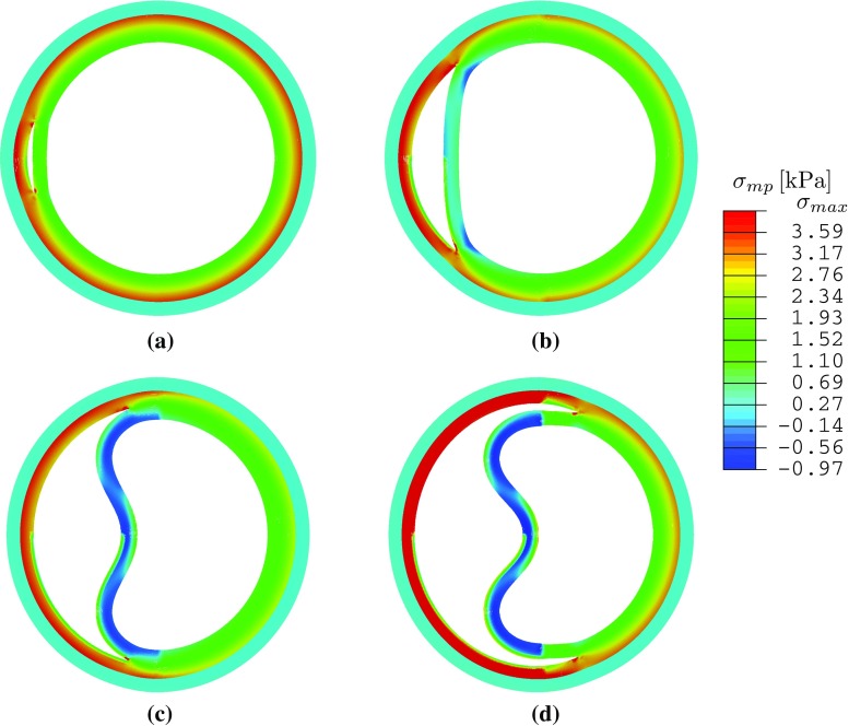 The maximum principal stress in the deformed configuration at the critical pressure is plotted for (above) and (below), with and without residual stress. a , , , kPa, kPa. b , , kPa, kPa. c , , kPa, kPa. d , , kPa, kPa