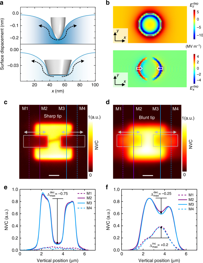 To compare the sharp and blunt tip-induced -redistribution we profiled the NVC maps, as indicated by vertical lines in Fig. 4c, d. Figure 4e, f show the corresponding NVC profiles. The overlapping NVC profiles along lines M1/M4 and M2/M3 demonstrate that the -redistribution is reproducible for both tip geometries. However, the response of to the applied force from these two tips are clearly different. The NVC profiles in Fig. 4e exhibit a maximum drop in NVC of along lines M2 and M3 but no appreciable increase in NVC () along lines M1 and M4. This implies that the sharp tip strongly depletes the -enriched regions but barely enriches the pristine regions. This result is in qualitative agreement with that in Fig. 2e, which shows that the fraction of the depleted that laterally move with the tip progressively decreases for applied forces larger than 6 µN. The NVC profiles in Fig. 4f, however, exhibit a maximum drop in NVC of −0.25 along lines M2 and M3 and increase by + 0.2 along lines M1 and M4. This implies that approximately 80% of the depleted laterally moved with the blunt tip. The strong reduction (improvement) of () thus confirms an active suppression of the out-of-plane migration and a simultaneous enhancement in the lateral transportation of , during scans with the blunt tip. Overall, the ability to deterministically move constitutes the first experimental demonstration of a controlled manipulation of in an oxide and the resulting two-dimensional spatial modulation.