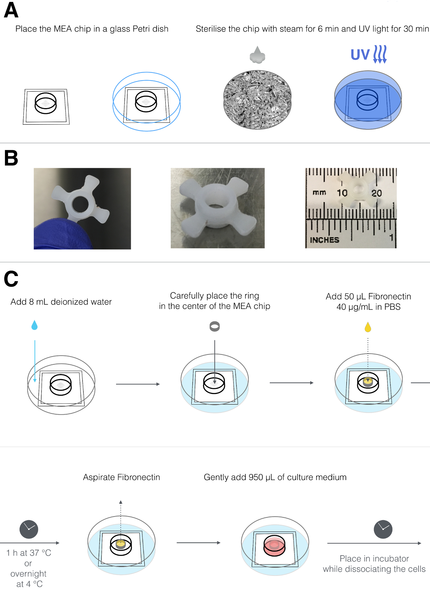 Figure 1: Sterilization and Coating of MEA Chips. (A) Scheme representing the sterilization process including placing the MEA chip in an autoclavable glass Petri dish, wrapping up in aluminum foil, steaming for 6 min, and exposing to UV for 30 min. (B) Top (left panel) and side (middle panel) views of custom PTFE ring; the ring has an outer diameter of 1.2 cm, including 4 flaps that allow its positioning in the center of the MEA chip and the inner diameter is 0.4 cm (right panel). (C) Schematic representing preparation of the MEA chip including placing the chip in a standard plastic Petri dish, adding 8 mL of deionized water outside the MEA chamber, placing the PTFE ring in the middle of the chamber, and coating the electrode array with fibronectin. After incubation time, fibronectin is removed and replaced with culture medium. Please click here to view a larger version of this figure.