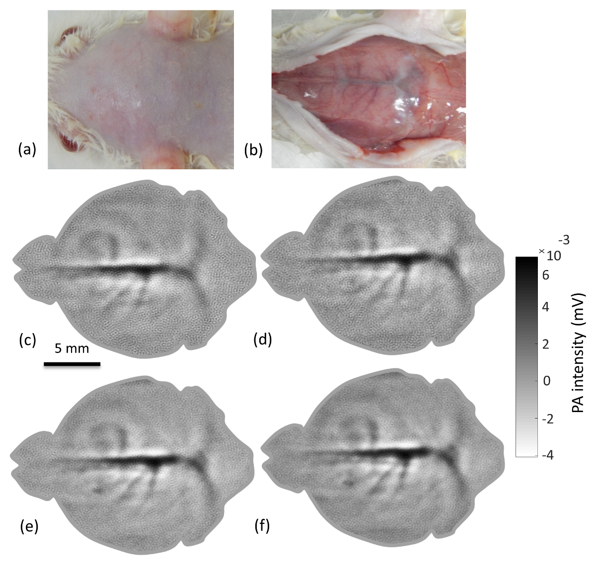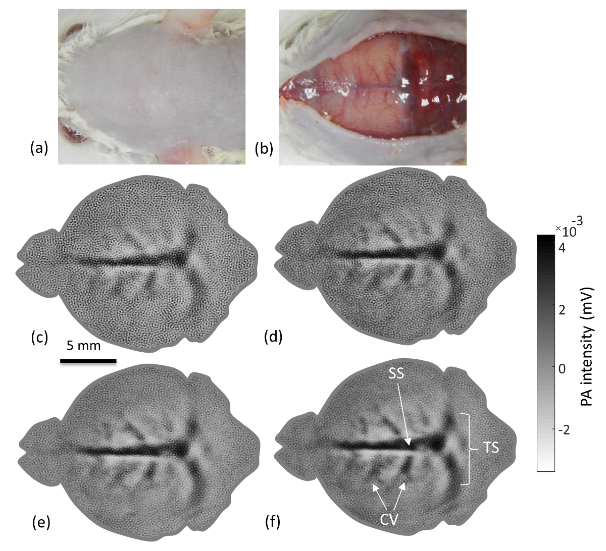 The in vivo brain imaging results that demonstrate the capabilities of the described PLD-PAT system are showcased in this section. To demonstrate the high-speed imaging capabilities of the PLD-PAT system, the in vivo brain imaging of two different healthy rats was performed. Figure 2 shows the brain images of a female rat (93 g) at various scan speeds. Figure 2a and b show the photographs of the rat brain before and after removing the scalp over the brain area. PAT imaging was done non-invasively (i.e., with the skin and skull intact). PA signals from the cross-section of the brain were collected by circularly rotating the UST for 5 s, 10 s, 20 s, and 30 s. Figure 2c-f show the PAT-reconstructed cross-sectional images of the rat brain, obtained in 5 s, 10 s, 20 s, and 30 s scan times. In all these brain images, the transverse sinus (TS), superior sagittal sinus (SS), and cerebral veins (CV), including branches, are clearly visible. These features are indicated on the image shown in Figure 2f. These results promise that the system can provide high-quality in vivo images, even at high scanning speeds.