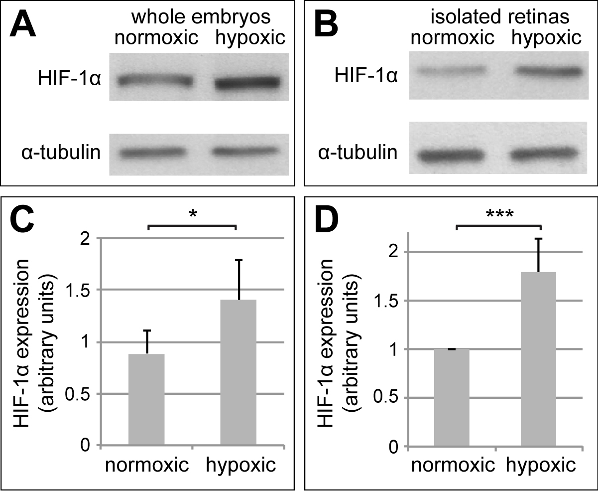 Figure 3: HIF-1α Levels Increase upon Hypoxia Induction in Xenopus Embryos and their Retinas. Western blots of protein lysates from whole embryos (A) or from isolated embryonic retinas (B) kept under normal oxygen concentrations or in hypoxia. Blots were probed for HIF-1α subunit and α-tubulin. At least 5 embryos or 22 retinas were taken for each condition (n = 5) (C, D) Quantification of the Western blot performed in (A, B), respectively. Protein levels of HIF-1α were normalized to the protein levels of α-tubulin. Error bars represent standard deviations between experiments. * p-value <0.05, *** p-value <0.001; n = 5. Please click here to view a larger version of this figure.