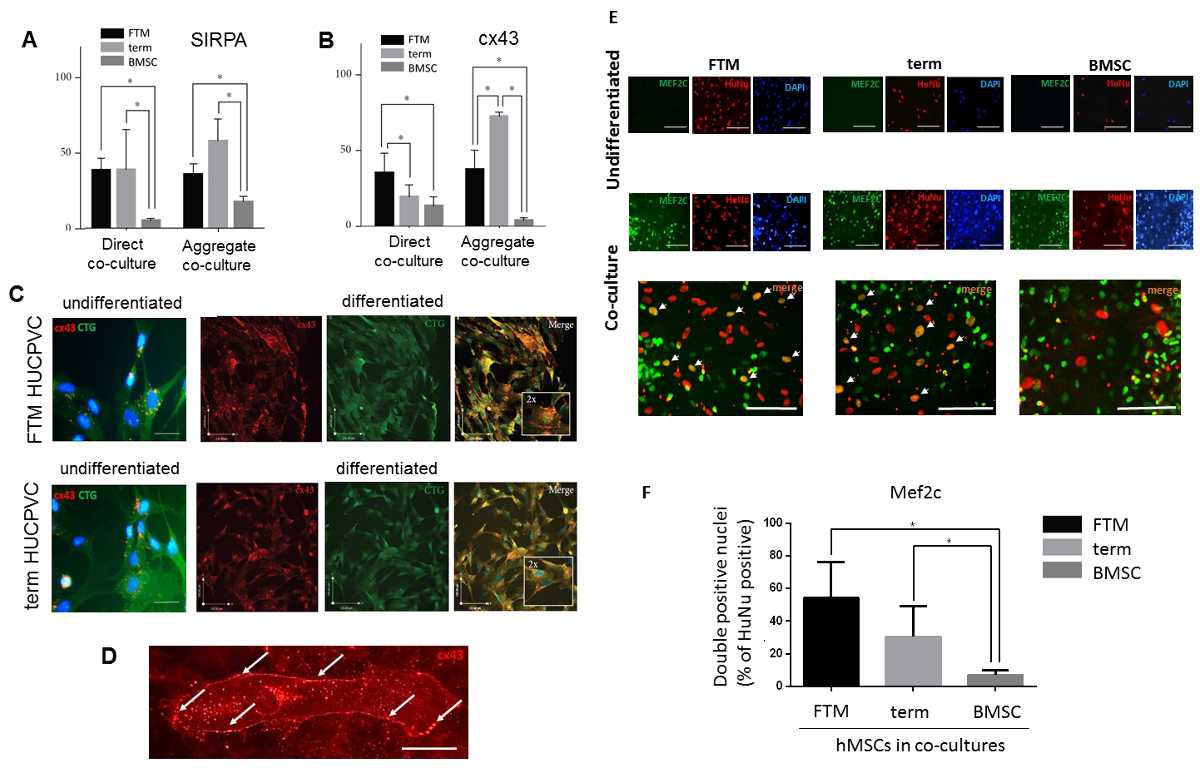 Mef2c nuclear cardiomyogenic differentiation marker was analyzed by ICC in undifferentiated human MSC cultures and human MSC, rat cardiomyocyte co-cultures (Figure 2). HuNu staining was performed concurrently to identify human MSC-originated cells in the cultures. Undifferentiated human MSC cultures did not show Mef2c-positive cells (Figure 2E, undifferentiated).Mef2c/HuNu double-positive cells were identified in co-cultures, with HUCPVCs presenting more double-positive nuclei than BMSCs (Figure 2E, differentiated, and Figure 2F). Statistical analysis has confirmed a significantly higher number (p < 0.01) of Mef2c-positive human nuclei in FTM and term HUCPVC-containing co-cultures compared to BMSCs (Figure 2F).