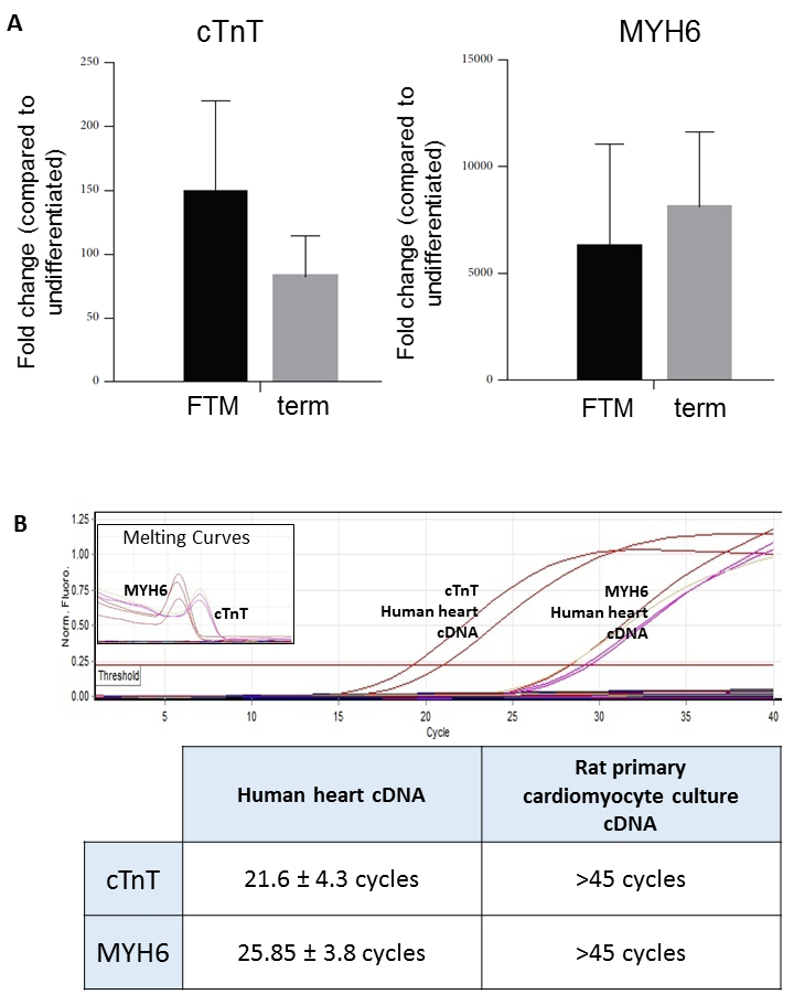 Figure 3: Quantitative PCR analysis of cTnT and MYH6. (A) Fold-increase of cardiac troponin (cTnT) and heavy chain cardiac myosin (MYH6) mRNA levels in TRA-1-85high FTM and term HUCPVCs sorted from direct co-cultures, compared to the undifferentiated state. (B) Representative graphs of dCt quantification of qPCR primer specificity testing on human and rat cDNA samples. The error bars refer to standard deviation (SD). The figure was adapted from Szaraz et al.51, with permission. Please click here to view a larger version of this figure.