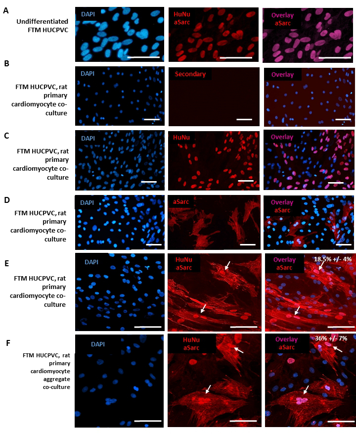 Figure 4: Alpha sarcomeric actinin staining of differentiated FTM HUCPVCs.(A) HuNu staining (red) of undifferentiated FTM HUCPVC cultures. (B) Secondary antibody control (red) on FTM HUCPVC, rat primary cardiomyocyte co-cultures. (C) HuNu staining (red) on FTM HUCPVC, rat primary cardiomyocyte co-cultures. (D) Alpha sarcomeric actinin (aSarc, red) staining of primary rat cardiac cultures. (E) HuNu/aSarc co-staining of rat primary cardiac cell, FTM HUCPVC direct co-cultures and (F) re-plated aggregate co-cultures. White arrows indicate human nuclei. DAPI = blue. Scale bar = 100 µm. The figure was adapted from Szaraz et al.51, with permission. Please click here to view a larger version of this figure.