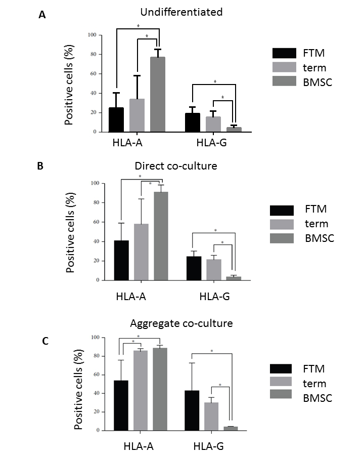 Figure 5: Immunological characteristics of MSCs after cardiac differentiation.(A) FC analysis of HLA-A and HLA-G expression in undifferentiated human MSC cultures. FC analysis of HLA-A and HLA-G expression in (B) direct co-cultures and (C) aggregate co-cultures of differentiated FTM HUCPVCs, term HUCPVCs, and BMSCs. Values expressed as the percent positive from the overall human cell number in corresponding cultures. The asterisk (*) indicates a statistically significant difference (p < 0.01). The error bars refer to standard deviance (SD). The figure was adapted from Szaraz et al.51, with permission. Please click here to view a larger version of this figure.