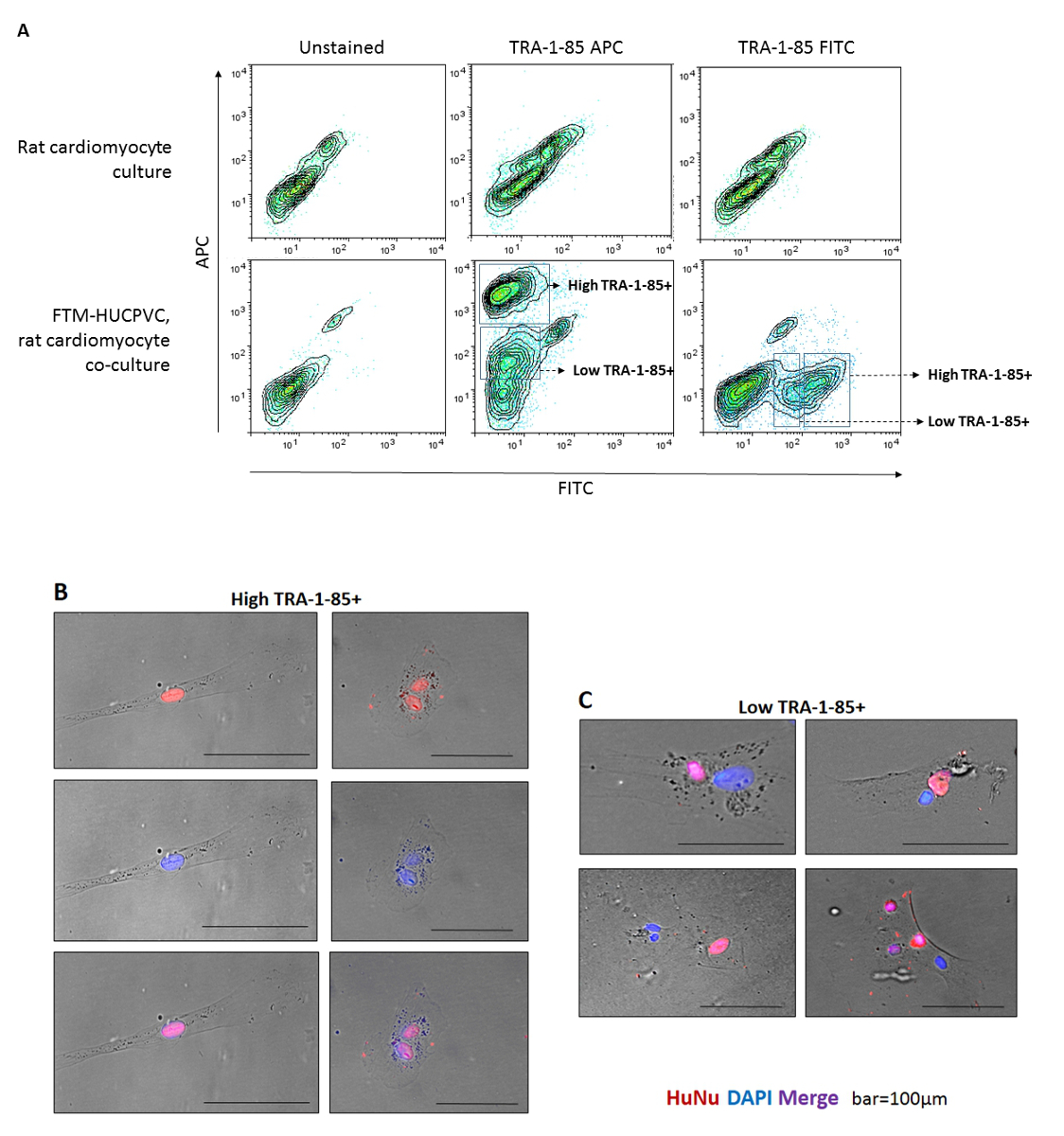 Supplementary Figure 1: Human cell detection in FTM HUCPVC, rat cardiomyocyte co-culture samples. (A) Flow cytometry analysis and gating strategy distinguishes human cells from mixed species populations using primary, fluorophore-conjugated TRA-1-85 human cell-surface marker-specific antibodies (FITC: x-axis, APC: y-axis). The inner boxes mark high and low TRA-1-85-positive cell populations, identified from co-cultures. (B) Immunocytochemistry analysis of high and low TRA-1-85-positive cell populations sorted from co-cultures using HuNu-specific antibody (red). Scale bar = 100 µm. The figure was adapted from Szaraz et al.51, with permission. Please click here to view a larger version of this figure.