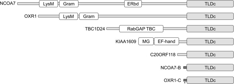 Domain architecture of mammalian TLDc proteins. Domains marked as TLDc: Tre2/Bub2/Cdc16 (TBC), Lysin Motif (LysM), Domain Catalytic; LysM: lysin motif; GRAM: GRAM domain; ERbd: estrogen receptor binding domain; RabGAP: GTPase activating protein; EF-hand: EF-hand domain; N-M: N-myristoylation domain. The accession numbers corresponding to the human isoforms as shown are: OXR1 (NP_001185461), OXR1-C (NP_001185464), NCOA7 (NP_001186548), NCOA7-B (NP_001186551), TBC1D24 (NP_001186036), KIAA1609 (NP_065998) and C20ORF118 (NP_001291712). The unique first coding exons of NCOA7-B and OXR1-C are shown in dark grey and the position of a premature stop codon mutation identified in OXR1-C in specific language impairment is marked with an asterisk (Chen et al. 2017)