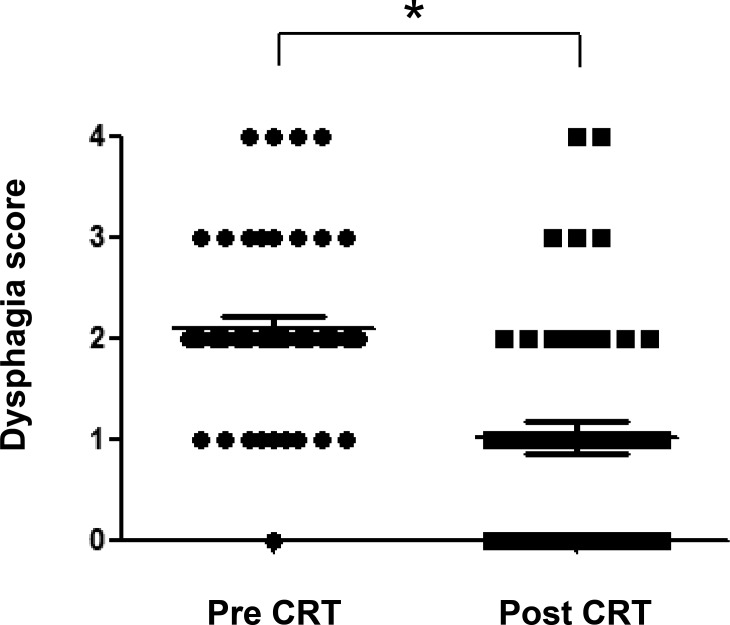 Figure 3. Distribution of dysphagia score (graded 0 to 4) before and after chemoradiotherapy (CRT) for the study patients.