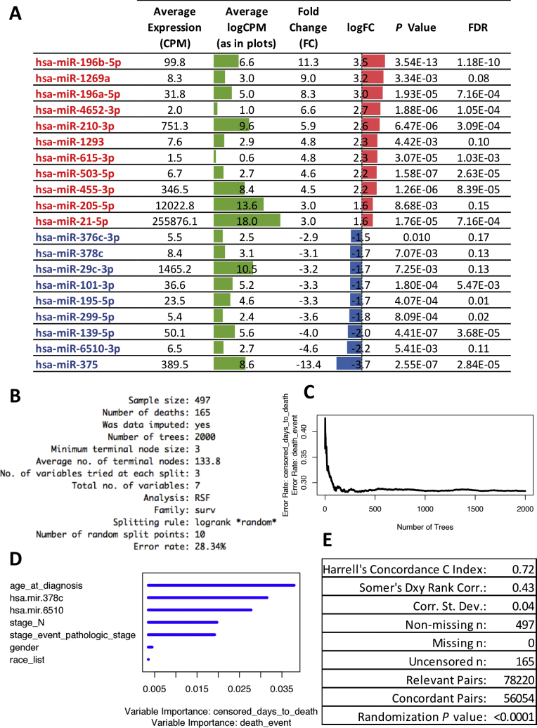 The Cancer Genome Atlas HNSC dataset was used to analyze level 3 miRNA-Seq data from 497 HNSCC patients. Differential expression (DE) analysis was implemented using the limma package and multivariate linear model that adjusted for the confounding effects of age at diagnosis, gender, race, alcohol history, anatomic neoplasm subdivision, pathologic stage, T and N stages, and vital status. Random forest (RF) for survival analysis was implemented using the randomForestSRC package.