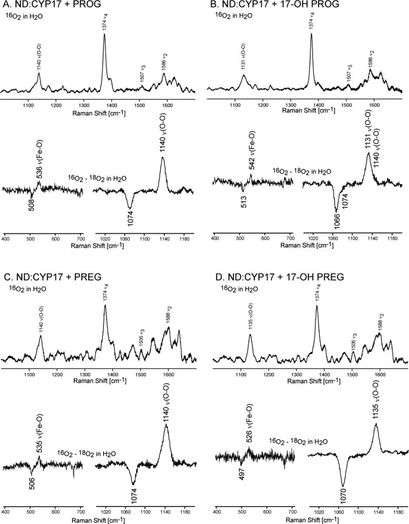 An especially effective demonstration of the potential of rR spectroscopy to reveal functionally significant H-bonding interactions with Fe-O-O fragments is given by the study of CYP17A1. [237] This cytochrome is responsible for standard hydroxylase chemistry, proceeding through the Compound I pathway, converting pregnenolone (PREG) and progesterone, to 17α-OH pregnenolone (17-OH PREG) and 17α-OH progesterone, respectively. [1,331,332] These hydroxylated products then participate in a second oxidative cycle in which the 17C–20C carbon-carbon bond is cleaved, in a “lyase” reaction, to form dehydroepiandrosterone (DHEA) and AD. [331,332] Interestingly, human CYP17 exhibits a higher product formation for 17-OH PREG over 17-OH PROG, prompting a long-standing debate as to the chemical mechanisms of this lyase activity.