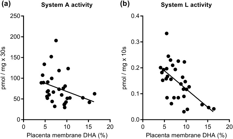 DHA supplementation increased erythrocyte (P < 0.0001) and placental membrane DHA levels (P < 0.0001) but did not influence maternal inflammatory status, insulin sensitivity, or lipids. DHA supplementation decreased placental inflammation, amino acid transporter expression, and activity (P < 0.01) and increased placental protein expression of fatty acid transporting protein 4 (P < 0.05).