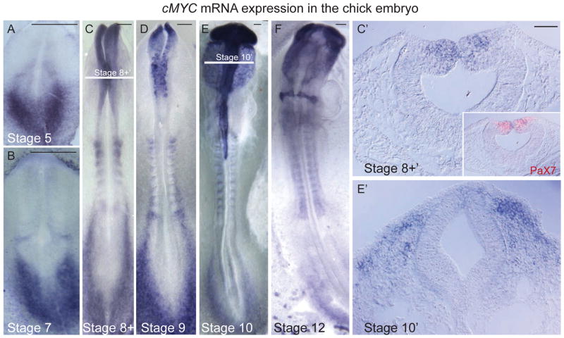 Given the existence of notable species specific differences in expression of cMyc in the early ectoderm, we performed a careful analysis of the expression pattern in the chick embryo by in situ hybridization (Figs 1 and S1). The results show that, unlike in the frog (Bellmeyer et al. 2003), cMyc expression is absent from the neural plate and neural plate border (Figs 1A–B, S1A–D) but is first detected in the cranial dorsal neural folds during neural tube closure at the 5–6 somite stage (Hamburger Hamilton, HH, stage 8+, Fig 1C). The expression overlaps with Pax7-immunopositive premigratory neural crest cells (Fig 1C′). Intense cMyc expression is maintained in neural crest cells throughout emigration and migratory stages (HH stages 9–12, Figs 1E–F S1E–F).