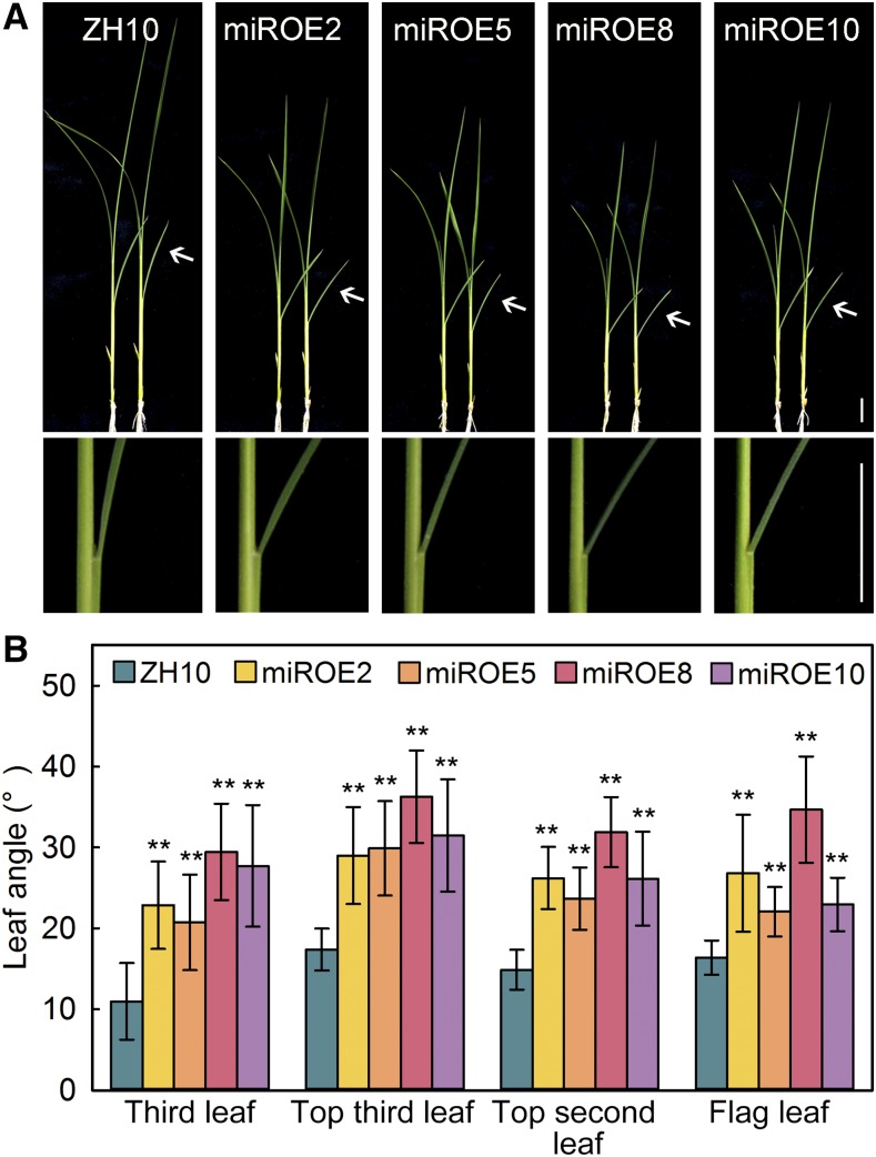 Our previous study showed that OsMIR396d over-expression transgenic plants (miROE) exhibited abnormal florets. OsmiR396d target genes, OsGRF6 and OsGRF10, were involved in regulating floral organ identity and husk opening (Liu et al., 2014). In miROE lines, the third leaf angles were increased to two times more than that of Zhonghua 10 (ZH10) at the seedling stage (Fig. 1, A and B). The increased leaf angle phenotype was also observed on the top three leaves of miROE lines at the seed filling stage (Fig. 1B). miROE8 had the highest expression level of OsmiR396d among the transgenic lines (Liu et al., 2014) and exhibited the largest leaf angle. The angles of the top third leaf of ZH10, miROE2, miROE5, miROE8, and miROE10 were 17°, 29°, 30°, 36°, and 32°, respectively (Fig. 1B).